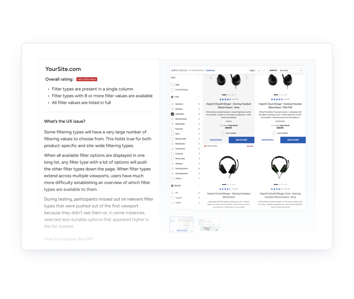 Each recommendation is tied directly to actionable and concrete UX guidelines that your team of designers and developers can follow with ease.