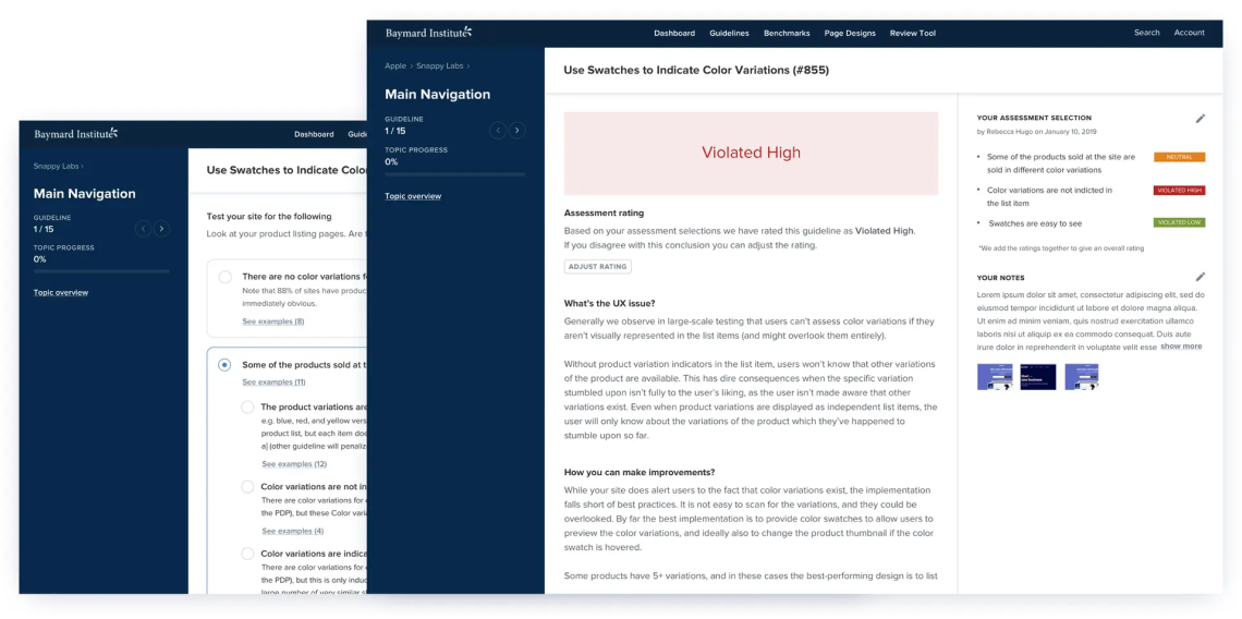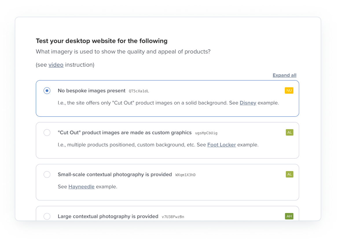 The Review Tool builds upon our audit team's nine years of experience conducting detailed UX audits. It contains more than 7,000 site implementation scenarios (or "UI patterns"), each traced back to specific findings from Baymard's UX research.
